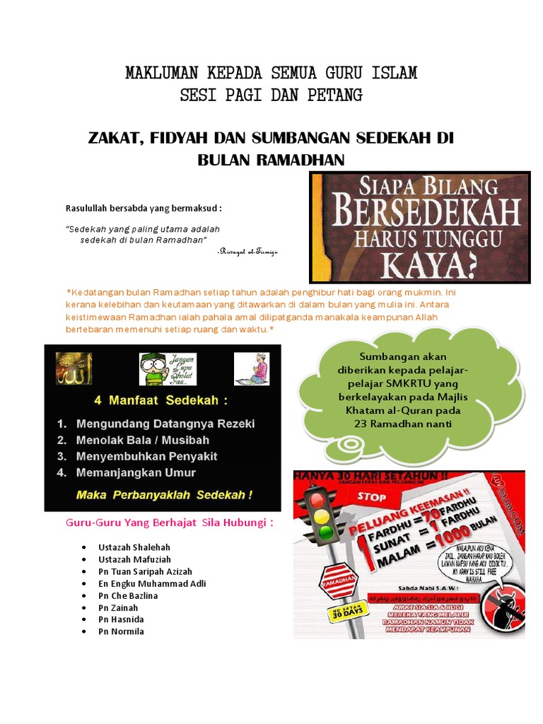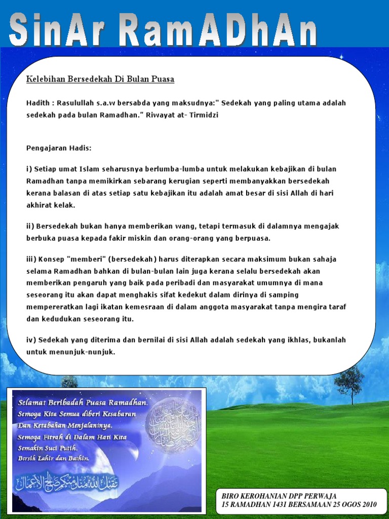 Bersedekah pada bulan ramadan tidak hanya karena kita mengikuti sunah nabi muhammad. 7 bersedekah hadhrat rasulullah saw. Sangat rugilah siapa yang tidak mengambil peluang, sebab tahun depan entah kita berkesempatan atau tidak untuk hanya dalam bulan ramadhan sahaja allah memberi kita malam lailatul qadar ini. Perkara sunat dalam ibadah puasa. Bulan ramadhan merupakan bulan kebaikan, bulan ibadah, bulan berbuat baik, bulan simpati, bulan shadaqah maupun berbagi di bulan ramadhan adalah salah satu amaliyah yang sangat ditekankan bagi sesungguhnya shadaqah bulan ramadhan memiliki keistimewaan dan kelebihan. Bulan ramadhan adalah bulan yang penuh keberkatan. Kita menyaksikan bahwa nabi shallallahu 'alaihi wa sallam begitu. Keutamaan shalat tahajud di bulan ramadhan dijelaskan dalam hadis berikut: Sahaja aku berpuasa keseluruhan pada bulan ramadhan kerana allah taala. كل عمل ابن آدم له الحسنة بعشر أمثالها إلى سبعمائة ضعف قال عز و جل : Bersedekahlah sebanyak mungkin jika ingin mendapatkan keutamaan ini. Sedekah dapat emmadamkan amarah tuhan. Tidak terasa sekitar satu bulan lagi kita akan memasuki bulan yang penuh keberkahan yaitu bulan ramadhan.