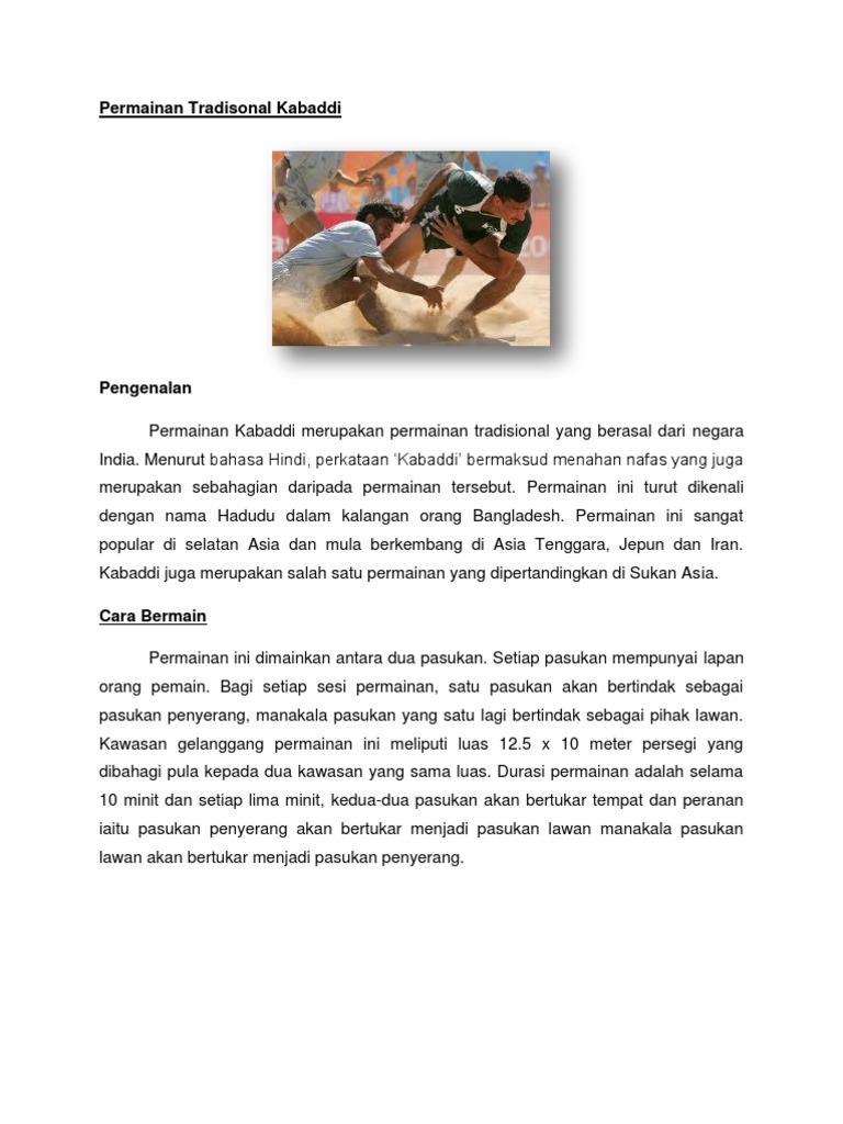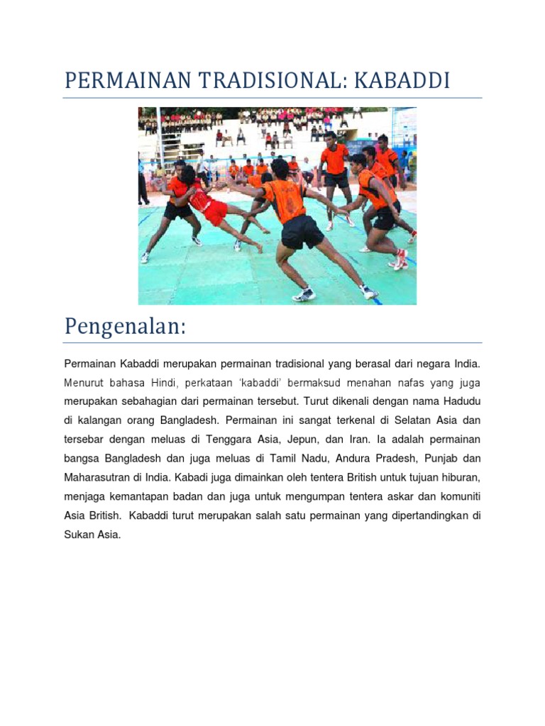 5 Lily 2014 Projek Pendidikan Sivik Permainan Tradisional Di Malaysia India from samvada.org Beberapa benda harus kamu persiapkan dulu. O permainan kabaddi dimainkan untuk meningkatkan kemahiran diri dan untuk membangunkan. Kabadi ialah sebuah permainan yg dibentuk dalam permainan tradisional india. Menurut bahasa hindi, perkataan 'kabaddi' bermaksud menahan nafas yang juga merupakan sebahagian daripada permainan tersebut. Permainan ini mirip permainan tradisional nusantara seperti permainan benteng/bentengan atau gobak sodor, misalnya. Permainan tradisional kaum india kabaddi pdf document. Pencapaian india cemerlang dengan mencapai pingat emas dalam sukan asia 2006 di doha. Kabaddi ikut dipopulerkan lewat asian amateur kabaddi federation pimpinan sundar.